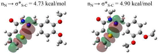 According to the crystallographic structures of LASSBio-1834 (3) and LASSBio-1835 (4), the imine nitrogen and sulfur atoms were separated by 2.695 and 2.693 Å, respectively; less than the sum of their van der Waals radii, which is another indication of the 1,5-N∙∙∙S interaction [7]. In this way, we analyzed the crystallographic structures in terms of a Natural Bond Orbital (NBO) analysis, using the CAM-B3LYP/6-311G(d) level of theory to specifically evaluate the 1,5-N∙∙∙S σ-hole intramolecular interactions. The NBO analysis indicated a direct orbital interaction between the imine nitrogen electron lone pair (nN) and one of the σ* orbital of the sulfur-carbon bonds (σ*S-C) in both systems (Figure 7). As expected by the similar distance values, the nN → σ*S-C interaction had a similar strength in both systems, being 4.73 kcal∙mol−1 in LASSBio-1834 (3) and 4.90 kcal∙mol−1 in LASSBio-1835 (4) (Figure 7). The small increase in the strength of the nN → σ*S-C interaction for LASSBio-1835 (4) is probably related to the methyl group presence in its structure, which can contribute to the increase of the imine nitrogen electron density. The theoretical results are in good agreement with the experimental data, showing that the unusual conformation of the analyzed compounds was mainly caused by a 1,5-N∙∙∙S σ-hole intramolecular interaction.