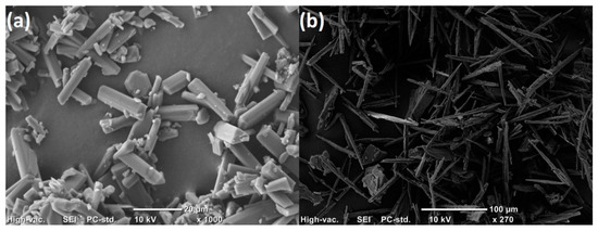 Scanning electron microscopy (SEM) image of LASSBio-1834 (3) crystals exhibiting plates shapes and relatively smooth surfaces (a) and LASSBio-1835 (4) crystals exhibiting needle-like shapes (b).
