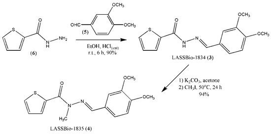 The title NAH compounds were prepared through a classical synthetic methodology that exploited the acid-catalyzed condensation of 2-thienylcarbohydrazide (6) with 3,4-dimethoxybenzaldehyde (5), both obtained from commercial sources (Scheme 1) [4,15]. In this condition, (3,4-dimethoxybenzylidene)-2-thienylhydrazide LASSBio-1834 (3) was obtained in 90% yield; next, it was converted to the corresponding N-methyl-N-acylhydrazone derivative (LASSBio-1835 (4)) after regioselective alkylation of the amide nitrogen, a resultant from treatment with methyl iodide under basic conditions (Scheme 1) [4,15].