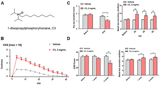 Chemical structure and function of C3. (A) Structure of 1-diisopropylphosphorylnonane, cryosim-3 (C3). (B,C) Visual analogue scale (VAS), (B) dry eye symptom score, and basal tear secretion (C) after single application of vehicle or C3. (D) Ocular surface disease index (OSDI) score, and basal tear secretion after application of vehicle of C3 four times a day for 2 weeks. * P < 0.05, ** P < 0.01, compared to baseline value or vehicle (Adapted from Yang et al. [12]).