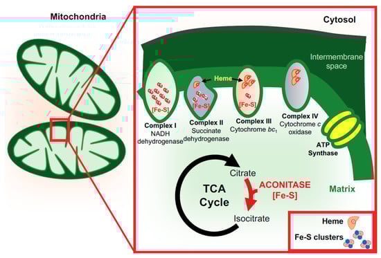 Iron and mitochondrial function. The mitochondrial electron transport chain contains multiple iron–sulfur clusters and heme-containing proteins necessary for ATP synthesis. NADH dehydrogenase (complex I) contains eight Fe–S clusters, succinate dehydrogenase (complex II) contains three Fe–S clusters and one heme moiety, while complex III (cytochrome bc1) contains one Fe–S cluster and several heme groups vital for its functions. Complex IV (cytochrome c oxidase) also contains two heme moieties. Aconitase, a key enzyme that catalyzes the stereo-specific isomerization of citrate to isocitrate through cis-aconitate in the tricarboxylic acid (TCA) cycle contain Fe–S clusters.