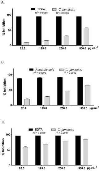 Antioxidant activity of C. jamacaru extract following DPPH, ABTS and Fe2+ chelation ions. (A) Antioxidant activity of C. jamacaru extract and of the Trolox standard shown by the percentage of inhibition of DPPH. (B) Antioxidant activity of C. jamacaru extract and of the ascorbic acid standard shown by the percentage of inhibition of ABTS. (C) Antioxidant activity of C. jamacaru extract and of the EDTA standard shown by the percentage in chelating activity on Fe2+ ions.