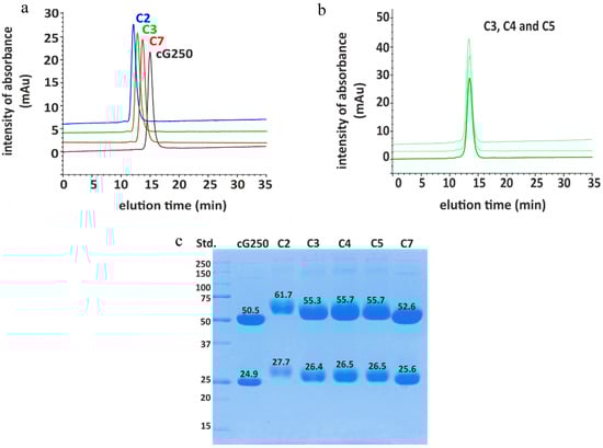 DOTA(SCN)-cG250 immunoconjugates with a range of BFC/mAb loading ratios were prepared and purified by modulating the duration of the bioconjugation reaction times between 30 and 90 min. Immunoconjugates were classified by their molecular weight (MW) after conjugation with DOTA(SCN): C2 (90 min reaction time) > C3 (60 min reaction time) > C7 (30 min reaction time) detectable by size exclusion-high performance liquid chromatography (SE-HPLC/UV) and sodium dodecyl sulfate polyacrylamide gel electrophoresis (SDS-PAGE) (Figure 1). For example, conjugate C2 obtained after 90 min of incubation time showed a retention time of 12.24 min compared to 15.1 min for the native mAb; a shift of 3 min on the SE chromatograms. Likewise, conjugates C3 (12.72 min elution time) and C7 (13.66 min elution time) were incubated for 60 and 30 min, respectively, which correlated with the expected increment of the MW of the conjugates after the protein conjugation with the BFC was indicated by the left shifting of the peak on the SE-HPLC chromatogram, compared to the native cG250 (Figure 1a). The completeness of the protein purification by filtration–centrifugation in the conjugates was corroborated by monitoring the signal intensity within the 30 min region on the SE-HPLC chromatogram, which corresponded to the elution time of the free BFC. The complete removal of BFC in the purified conjugate is a critical parameter to ensure high radiochemical purity.