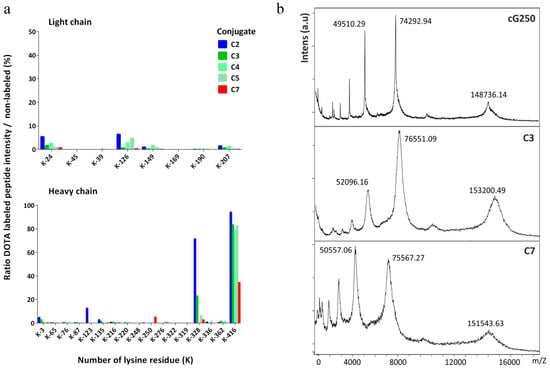Characterization of the DOTA(SCN)-cG250 conjugates by mass spectrometry: (a) Lysine occupancy in the LC (top) and HC of DOTA(SCN)-cG250 post trypsin in-gel digestion of the proteins (n = 3) in conjugate C2 (90 min), C3, C4, C5 (60 min), and C7 (30 min) and (b) mass measurements by MALDI-TOF MS of native cG250 and conjugates C3 and C7.