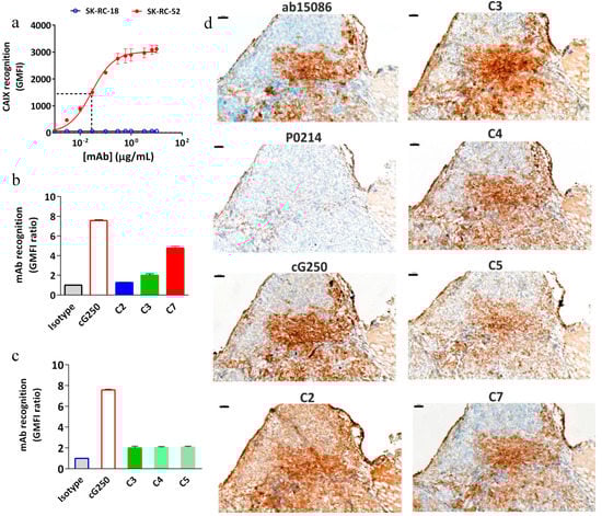 Immunoreactivity of DOTA(SCN)-cG250 conjugates with SK-RC-52 cells in vitro and in tumor tissue. (a) Concentration-dependent binding of native cG250 to SK-RC-52 cells and SK-RC-18 (control), as assessed by flow cytometry. The red dashed line corresponds to the IC50. (b) Flow cytometric assessment of CAIX recognition on SK-RC-52 cells of immunoconjugates C2 (90 min), C3 (60 min) and C7 (30 min). (c) Flow cytometric assessment of CAIX recognition on SK-RC-52 cells of immunoconjugates C3, C4, and C5 (60 min). (d) CAIX immunostaining in frozen SK-RC-52 tumor samples using native cG250 mAb and immunoconjugates C2, C3, C4, C5, and C7. CAIX Abcam (ab15086) as a positive control and Dako (P0214) as a negative control. 100 μm scale bar and 10X objective.
