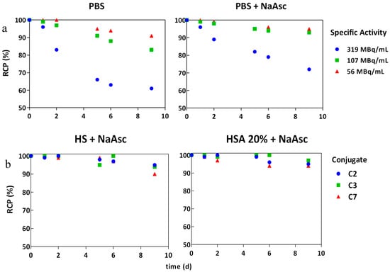 Stability of the radioimmunoconjugates becomes a critical issue for conjugated mAb due to their pharmacokinetics and long circulation times. In vitro stability was studied under different conditions: HSA 20%, human serum (HS) and phosphate-buffered saline (PBS) with and without the addition of sodium ascorbate (NaAsc, 50 mg/mL) postpurification. Figure 4a shows a drop in the RCP of the radioconstruct two days after labeling at 319 MBq/mL activity concentration (specific activity was > 9 MBq/µg), even in the presence of the 50 mg/mL quenching solution. We assume that the protein was damaged to a certain degree, due to the formation of radical ions by radiolysis during the labeling process. Nevertheless, radiostability of [177Lu]DOTA(SCN)-cG250 at lower specific activities (<3 MBq/µg) and activity concentrations (<107 MBq/mL) was increased by the addition of NaAsc (Figure 4a). The RCP was above 90% by ITLC up to 10 d postlabeling in 20% HSA and HS for the three types of conjugates (Figure 4b).