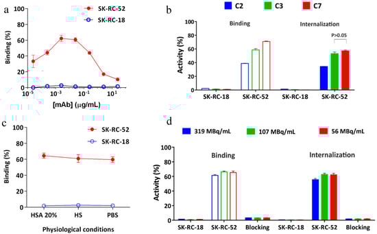Radioimmunoactivity in vitro of [177Lu]DOTA(SCN)-cG250 to SK-RC-52 cells (n = 3). (a) Concentration-dependent binding of [177Lu]DOTA(SCN)-cG250 using the conjugate C3 (60 min). (b) Recognition of radioconstructs from conjugates C2 (90 min), C3 (60 min) and C7 (30 min) to SK-RC-52 cells by radioimmunoassay at 2 MBq/µg specific activity. (c) Radioimmunoactivity in HSA 20%, HS and PBS at 2 MBq/µg specific activity using the conjugate C3. (d) Radioimmunoactivity of [177Lu]DOTA(SCN)-cG250 at different activity concentrations using the conjugate C3. Blocking studies were performed with 50 µg of native cG250.
