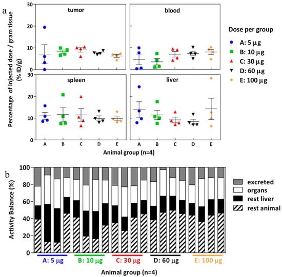 The biodistribution of [177Lu]DOTA(SCN)-cG250 which was measured 48 h after the I.V. application of 12 MBq in BALB/c nu/nu mice across a range of Ab protein mass doses (specific activities) shows a moderate influence by the total applied protein dose (Figure 6). In vivo, blood retention increased with higher protein doses (i.e., lower specific activity) and liver uptake slightly declined with protein doses up to 60 µg/animal. In contrast, tumor accumulation was not significantly influenced (p > 0.05) by total protein doses between 5 and 100 µg per animal. Correspondingly, at higher protein doses blood circulation seemed prolonged and tumor uptake was highest at a relatively high amount of cG250 (30 µg) per animal (Figure 6a). In addition, a higher amount of radioactivity remained in the rest of the animal body (skin, blood, muscles, and bones) for animals with higher administrated protein doses and the excretion process was low (Figure 6b). Longer circulation and the remaining activity in the rest of the animal may be correlated to the saturation of the binding sites in the target, which was observed during the blocking studies. A reduction of tumor uptake at 24 h (p < 0.05) was observed in the animals with a previous injection of 500 µg of native cG250 (Figure S4). The native mAb was injected shortly before the radioconjugate and CAIX receptors where partially blocked. However, a major impact by the blocking in spleen and liver was not observed.