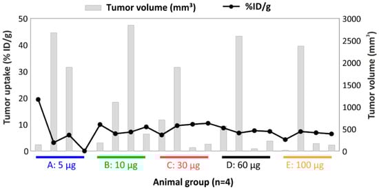 Tumor volume had more influence on tumor uptake when low protein doses were used (Figure 7). Interestingly, for one animal bearing a small tumor (140 µg), a positive out layer was observed in the group receiving the lowest protein dose. In case of higher doses, the %ID/g was similar across mass doses and was independent of the tumor size (Figure 7). The effect of the tumor weight on tumor retention has been studied in previous work, where an exponential decline of tumor uptake of 111In-DTPA-girentuximab was demonstrated [].