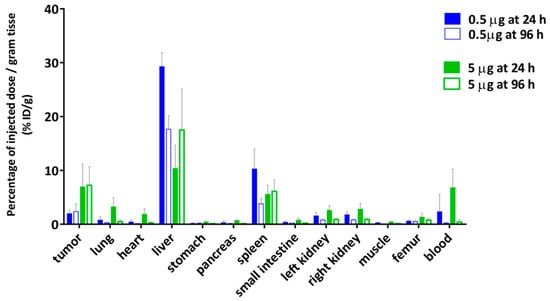 In order to determine the availability of the radioconstruct in blood and in vivo stability, a metabolism analysis was performed by protein precipitation (data not shown). The percentage of the activity was >50% in plasma showing a low complexation with blood cells. Another important parameter is the percentage of free 177Lu activity in blood plasma relative to the intact labeled radioconstruct. The percentage of free 177Lu was <5% at 24 h and increased to 10% at 96 h from the release of the radiometal. Indeed, the tumor/blood (T/B) ratio increased at 96 h (0.5 µg) to 10.16 (Figure 8a) when the specific activity was <3 MBq/µg. This could indicate the importance of the radiostability of the radioconstructs in vivo. Therefore, tumor uptake was low but in line with the values obtained by Muselaers, C. H. (escalating doses of 111In-DTPA-G250) comparing the lower protein dose (<5 µg) [].