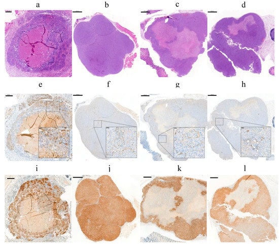 Evaluation of vascular density and hypoxia in FFPE from four different SK-RC-52 tumors: (a–d) (H&E) staining; (e–h) CD31 immunostaining; and (i–l) HIF1α staining. (a) 200 µm scale bar, 5x objective. (b–d) 1000 µm scale bar, 1.5x objective; (inset) 50 µm scale bar, 20x objective.