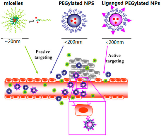 The passive target is a common strategy to increase the specific accumulation in target tissues [15,63]. By optimizing the physicochemical properties, the polymer nanocarriers can accumulate in the tumor tissues selectively through the EPR effect due to their prolonged circulation time in the blood [3]. Many nanocarrier systems based on biodegradable polymer have been used in PDT. By incorporating hydrophobic PSs into nanoparticles, and the non-aggregated PSs revealed higher 1O2 quantum yield than their aggregates [68,69]. The nanoparticles can selectively accumulate within the target tumor tissue and enhance the light-dark toxicity ratio [70,71].