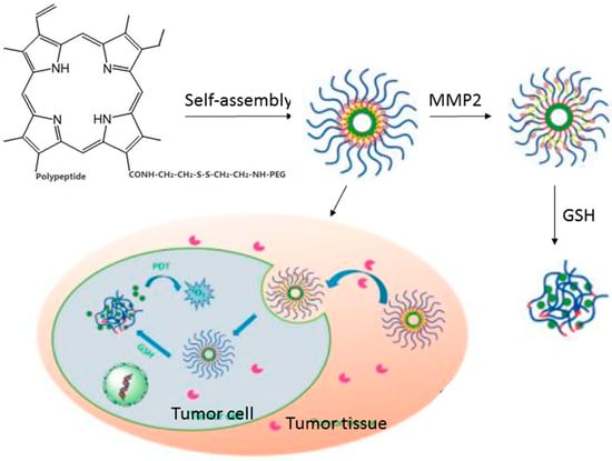 The matrix metalloproteinases (MMPs) are the drivers of angiogenesis and metastasis, and overexpressed on endothelial tumor cells [89,91]. Cui et al. developed a redox-responsive nanocarriers for MMP2-targeting photodynamic therapeutic (Figure 3) [52]. The model PS was modified with hydrophobic polypeptide and hydrophilic polyethylene glycol (PEG) via MMP2-cleavable conjugate structure and GSH-responsive disulfide linker, respectively. After forming nanoparticles via self-assembly in aqueous solution, the nanocarrier can specifically accumulate in the areas of the tumor owing to the EPR effect and MMP2 targeting. After that, the free Ce6 was delivery in tumor cells triggered by GSH and significantly improved PDT efficiency [52].