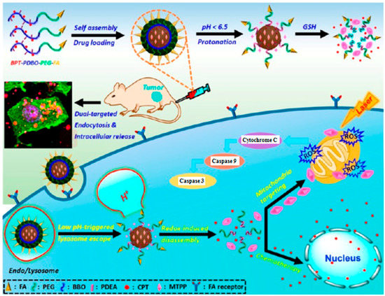 Mitochondria, cellular organelle with a two-membrane structure, has high membrane potential (negative inside) and this makes it possible to target the mitochondria with cations, triphenylphosphonium (TPP) cation for example [63,130,131]. A smart drug delivery system with the function of tumor cell and mitochondria targeting was fabricated based on graphene oxide (NGO) [127]. Integrin αvβ3 monoclonal antibody was used to modify NGO and target the tumor cells by the specific recognition between the integrin and its receptor on the cancer cells surfaces. Just as designed, the nanocarrier can effectively target the tumor cells and enhance cellular uptake. Once internalized, the modified NGO can escape from lysosomes and subsequently selectively accumulate in the mitochondria by electrostatic interaction with the negatively-charged mitochondria membrane. Cai et al. reported a pH and GSH cascade-responsive nanocarrier for dual-targeted chemo-photodynamic therapy [101]. Cationic porphyrin derivative, as the mitochondria-targeting PS, was encapsulated in polymeric micelle. The FA and camptothecin (CPT) were covalently conjugated with the polymeric micelle to modulate the biodistribution of drugs on systemic, local, and subcellular levels. After accumulating at tumor site via EPR effect, the prodrug nanocarrier can significantly enhance uptake efficiency by the folate receptor-mediated endocytosis. When escaping from lysosome, the CPT and PS are released in response to GSH in cytoplasm. Furthermore, the PS could selectively target mitochondria by electrostatic interaction and induce mitochondrial apoptotic, while the CPT could travel to the cell nucleus by diffusion and implement chemotherapeutic (Figure 5) [101].