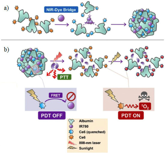 NIR light is an excellent external stimulus to trigger the activity of PSs for its deep penetrability and exact controllability. Wu et al. designed a light-triggered switchable nanoparticle by quenching the Ce6 with near-infrared (NIR) dye IR-780 iodide (IR780) to reduce skin photosensitization in PDT [184]. The nanoparticle was fabricated by encapsulating the IR780 with self-assembling albumin-PS conjugates. Due to the good match of the spectrum, the pathway of Ce6 for singlet oxygen generation is suppressed by IR780 when in aggregation state, and the nanoparticle has no phototoxicity to the skin. After degradation of IR780 under NIR irradiation, the nanocarrier disaggregates and “turns on” the photosensitizer of the Ce6 (Figure 6).