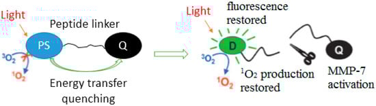 - Zheng, G.; Chen, J.; Stefflova, K.; Jarvi, M.; Li, H.; Wilson, B.C. Photodynamic molecular beacon as an activatable photosensitizer based on protease-controlled singlet oxygen quenching and activation. Proc. Natl. Acad. Sci. USA 2007, 104, 8989–8994. [Google Scholar] [CrossRef] [PubMed]