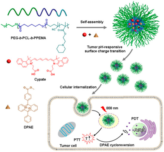 Endoperoxide derivatives can generate 1O2 by chemical reaction, which is independent with the hypoxia microenvironment [203]. Ge et al. devised an oxygen-independent polymeric nanocarrier for combined PTT/PDT [204]. The nanoparticle was prepared by encapsulating the cypate and diphenylanthracene endoperoxide (DPAE, singlet oxygen donor) within a triblock copolymer. The nanocarrier had weak negative potential at pH 7.4 and showed remarkable tumor accumulation in tumor tissues due to prolong circulation time in the serum. After protonated in tumor tissues (at pH 6.8), the zeta-potentials turned to positive (+11 mV) and the internalization of the nanocarrier was accelerated. The cypate could induce remarkable hyperthermia under 808 nm NIR irradiation and implement potential PTT. Simultaneously, the DPAE went through thermal cycloreversion and generated singlet oxygen without participation of oxygen molecules in this process. This oxygen-independent combined PTT/PDT therapy strategy offers a rational opportunity to extend the category of PDT (Figure 8).