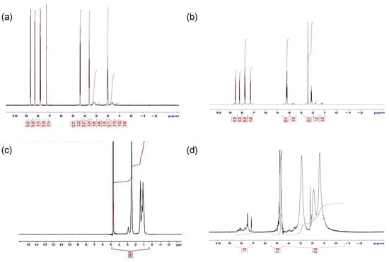 The structures of intermediates and products were analysed by 1H-NMR (Figure 2). Peak assignments for the 1H-NMR spectra of the naphthalimido alcohol product 1 were as follows: 2 ppm alkyl chain CH2, 3.6 ppm alkyl chain CH2 beside an O atom and O-H, 4.4 ppm alkyl chain CH2 beside a N atom and 7.8–8.6 ppm aromatic protons (Figure 2a). The O-tosyl spectrum (Figure 2b) showed assigned peaks at 2.2 ppm alkyl chain CH2, 2.5 ppm CH3 attached to an aromatic ring, 4.3 ppm alkyl chain CH2s beside O and N atoms and 7.3–8.5 ppm aromatic protons. The PAA showed characteristic peaks at 1.3 ppm CH2, 1.7 ppm CH, 2.2 ppm CH2 attached to -NH2 of PAA (Figure 2c). After modification with the naphthalimide group (PAA-propylnaphthalimide, Figure 2d) the spectrum showed additional aromatic proton peaks at 7.3–8.5 ppm, while the remaining propylnaphthalimide peaks were overlapped with the PAA peaks. The peak at 3.3 ppm was due to water.