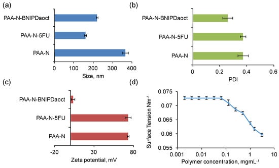 Surface tension measurement was used in order to determine the critical aggregation concentration (CAC) in aqueous media of the self-assemblies formed. The surface tension graph for PAA-N (Figure 3d) showed that the surface tension remains unchanged from that of water (0.00726 Nm−1) at very low concentrations (up to 0.065 mg mL−1). However, with increasing polymer concentration, surface tension decreased dramatically. The CAC value was determined from the surface tension graph to be 0.125 mg mL−1.