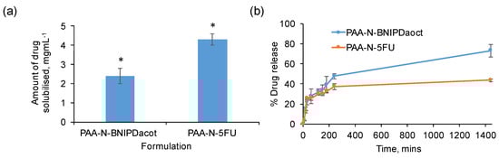 Drug loading (a) and release (b) studies of 5-FU and BNIPDaoct into and from PAA-N self-assemblies (n = 3, ± SD). * denotes a significant increase in aqueous solubility compared to the unformulated drug (p < 0.01). Studies were quantified using UV-Vis spectroscopy (5-FU) and HPLC (BNIPDoact).