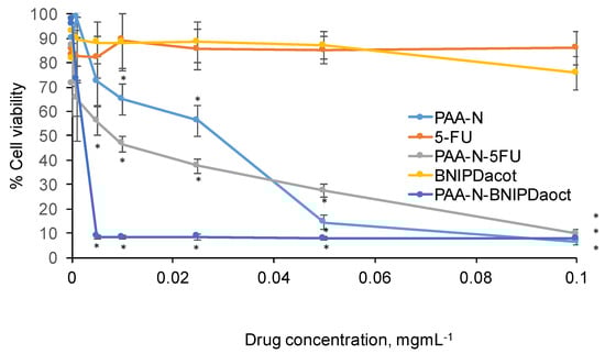 The cytotoxic effect of PAA-N, BNIPDaoct, 5-fluorouracil, PAA-N-BNIPDaoct and PAA-N-5FU was determined by MTT assay in BxPC-3 cells after 24 h exposure (Figure 5). The data showed that both free drugs did not result in any significant decrease in cell viability over the concentrations tested.