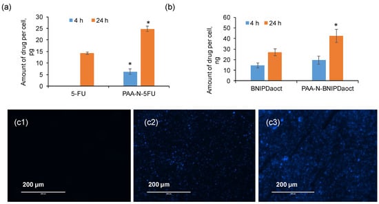Drug uptake in BxPC-3 cells was measured quantitatively using UV-Vis spectroscopy (5-FU) and HPLC (BNIPDoact) allowing for the amount of drug per cell to be estimated. Figure 6a shows the amount of 5-FU internalised into the cells, here it is evident that the 5-FU encapsulated within the PAA-N resulted in significantly greater (p < 0.001) uptake compared to the free drug. The BNIPDaoct resulted in greater cellular internalisation (Figure 6b) compared with the 5-FU. The enhancement of cellular internalisation due to the polymer encapsulation was not as pronounced in these studies. However, the intrinsic solubility of the free drug was so low that in order to administer to the cells, DMSO was required to solubilise the drug. This ability to become solubilised in organic solvents, means the BNIPDaoct is more likely to permeate well into the cells without the use of excipients—however, in order to be administered intravenously in patients, this highly insoluble drug does need to be solubilised initially.