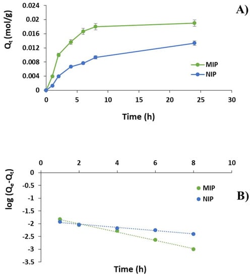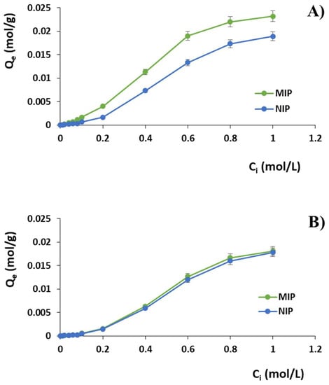 The obtained experimental data were also fitted using the Langmuir and Freundlich models (Figure 2B,C). As it is possible to observe from the Langmuir model, NIP presents a higher Qmax value than MIP (Table 3). This result is acceptable because this kind of model assumes that all the binding sites are homogeneous. However, this assumption is far from being true for all cases of Molecularly Imprinted Polymers that cannot fit so well to a homogeneous model. On the contrary, the Freundlich model proposes a non-ideal adsorption on heterogeneous surfaces, which is not restricted to the formation of a monolayer.