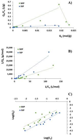 The Scatchard model is often used to characterize MIP adsorption properties and collect information about the affinity distribution of the binding sites discerning whether these sites are homogeneous or heterogeneous. Scatchard analysis was performed using Equation (2):