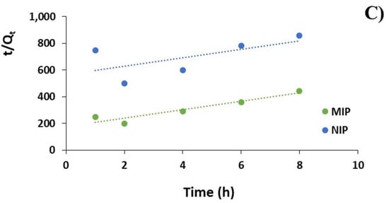 (A) DC adsorption kinetic curves for MIP and NIP; (B) DC adsorption kinetics according to pseudo-first order model; and (C) pseudo-second order model.