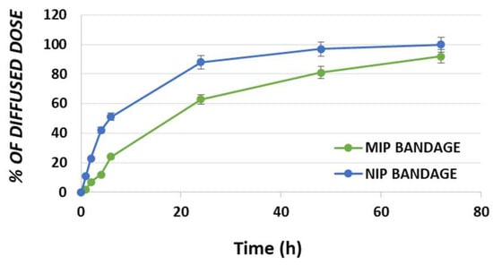 As it is possible to observe in Figure 4, the drug diffusion process is characterized by three different steps such as burst, time delay and stable diffusion. The bandage prepared using DC loaded NIP particles showed a percentage of the diffused dose equal to 51% within the first 6 h reaching the 88%, 97% and 100% in 24, 48 and 72 h, respectively. On the other hand, the bandage incorporating DC loaded MIP particles exhibited a value of 24% after the first 6 h and achieving 63%, 81% and 92% at the time points of 24, 48 and 72 h, respectively.