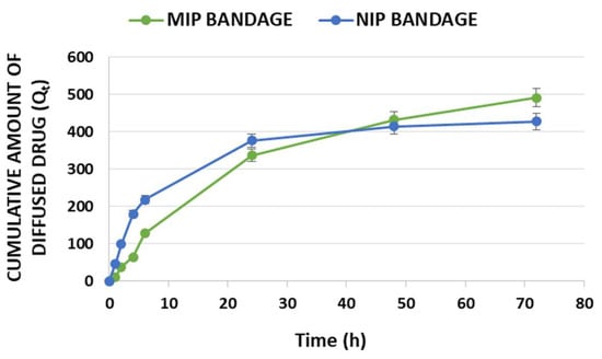 In Figure 5, the cumulative amount (Qt) of diffused diclofenac is reported. The obtained in vitro profiles are due to the different polymeric matrices employed in the preparation of the two tested textiles. The imprinted polymer is able to load a higher amount of drug compared to the non-imprinted one in the same experimental conditions. This explains the observed J and Kp values (Table 5) and why the cumulative amount of diffused DC at 72 h is higher for the MIP-based bandage even though the percentages of diffused dose at the same time were 92% and 100% for MIP and NIP textiles, respectively.