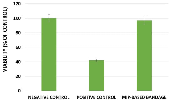 The EPISKIN prediction model was used to evaluate the skin irritation potential of the developed smart bandage prepared using the DC imprinted particles. The obtained results in the terms of cell viability, reported in Figure 6, confirmed the absence of irritation effects for the smart bandage.