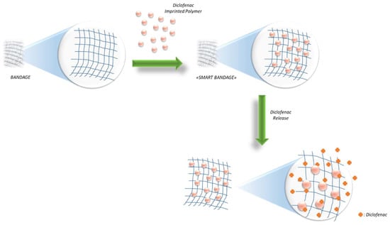 Based on these considerations, Diclofenac Imprinted Polymers for the sustained release of this anti-inflammatory agent were synthesized and incorporated into a bandage to prepare a novel smart dressing for the topical administration of DC by covering the textile with the drug loaded polymeric particles.