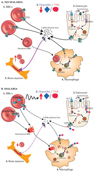 The malaria—iron deficiency hypothesis. (A) In healthy children without malaria (A1), concentrations of hepcidin and TNF-α are low (A2) leading to increased absorption of iron through enterocytes (A3), reduced hemolysis of RBCs and increased recycling of iron recovered from senescent RBCs by macrophages (A4). More iron is thus available for the production of new RBCs (A5). (B) On the other hand, during malaria infection, blood-stage malaria parasites (B1) elicit increased production of hepcidin and TNF-α (B2), which, in turn, block absorption of iron through DMT1 and ferroportin (FPN) on enterocytes (B3). Hepcidin also degrades ferroportin on both infected and uninfected RBCs leading to accumulation of intracellular iron, oxidative stress, and consequently hemolysis. Hemolyzed RBCs are taken up by the macrophage (B4). Hepcidin and TNF-α inhibit recycling of iron recovered from hemolyzed RBCs back into the circulation leading to deficiency of the amount of biologically available iron. Consequently, little iron is available to produce new RBCs by the bone marrow leading to iron deficiency anemia (B5). Tf, transferrin.