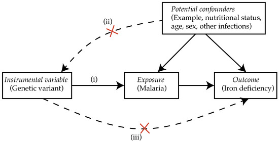Similarly, MR can be utilized to study whether malaria causes iron deficiency. There are known genetic polymorphisms that are associated with resistance to malaria. For example, sickle cell trait which results from inheritance of one abnormal allele of the beta-globin gene is associated with 50% protection against uncomplicated clinical malaria and 86% protection against severe malaria [71]. Alpha- and beta-thalassemias, glucose-6-phosphodehydrogenase (G6PD), ABO blood group, and glycophorins are additional genes known to be associated with resistance to severe malaria [72]. If malaria causes iron deficiency, then polymorphisms that protect from malaria would also be associated with reduced risk of iron deficiency. However, the polymorphisms should only influence iron status through malaria, thus the effect of the polymorphism(s) on iron status should only be observed in populations at risk of malaria but not in malaria-free populations (i.e., there should be no pleiotropy or independent effect of the polymorphisms on iron status). Additionally, each of the protective polymorphisms should influence iron deficiency in the same direction [73,74]. Figure 2 illustrates the conceptual MR causal diagram for malaria and iron deficiency.