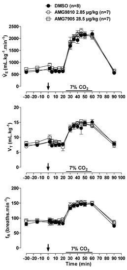 Effects of intracerebroventricular (icv) microinjection of vehicle (DMSO), AMG9810 (TRPV1 antagonist—2.85 µg/kg, 1 µL) and AMG7905 (TRPV1 antagonist—28.5 µg/kg, 1 µL) on ventilation (), tidal volume (VT) and respiratory frequency (fR) of rats during normocapnia and hypercapnia (7% CO2). The arrow indicates the time of the microinjection. The hypercapnia duration is represented by a horizontal line on the graph. Values are expressed as mean ± S.E.M.