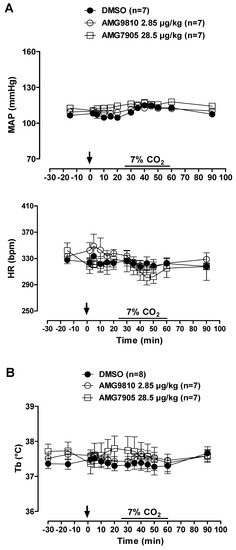 Effects of intraperitoneal (ip) injection of vehicle (DMSO) and AMG9810 (TRPV1 antagonist—2.85 µg/kg, 1 mL/kg) on (A) mean arterial pressure (MAP) and heart rate (HR) and (B) body temperature (Tb) of rats during normocapnia and hypercapnia (7% CO2). The arrow indicates the time of the microinjection. The hypercapnia duration is represented by a horizontal line on the graph. Values are expressed as mean ± S.E.M.