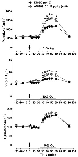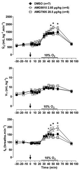 Hypoxia caused an increase in in all animals (effect of time: p < 0.001; Figure 3); however, the hypoxic ventilatory response was significantly more pronounced in the animals that received central injection of AMG9810 at 45, 50 and 60 min of hypoxic exposure (effect of treatment: p < 0.05; Figure 3), due to a higher fR (effect of treatment: p < 0.01; Figure 3). Central AMG7905 did not change the hypoxic ventilatory response.