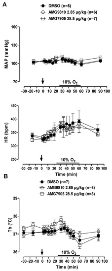 2.4. Effect of Intraperitoneal Injection of AMG9810 on , MAP, HR and Tb in Normoxic and Hypoxic Conditions