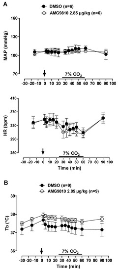 2.3. Effect of Intraperitoneal Injection of AMG9810 on , MAP, HR and Tb in Normocapnic and Hypercapnic Conditions