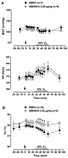 Effects of intraperitoneal (ip) injection of vehicle (DMSO) and AMG9810 (TRPV1 antagonist—2.85 µg/kg, 1 mL/kg) on (A) mean arterial pressure (MAP) and heart rate (HR) and (B) body temperature (Tb) of rats during normoxia and hypoxia (10% O2). The arrow indicates the time of the microinjection. The hypoxia duration is represented by a horizontal line on the graph. Values are expressed as mean ± S.E.M. * Significant difference between vehicle and AMG9810 groups.