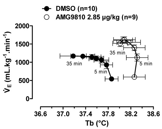 Relationship between pulmonary ventilation (; data from Figure 7) and body temperature (Tb; data from Figure 8B) in rats treated with vehicle (DMSO) or AMG9810 (TRPV1 antagonist—2.85 µg/kg, 1 mL/kg). The direction of time is shown with arrows, and the times corresponding to the earliest (5 min) and latest (35 min) hypoxia exposure data points are indicated. Values are expressed as mean ± S.E.M.