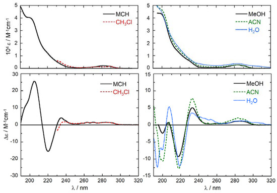 Tolterodine (1) contains two aromatic chromophores attached to the same carbon atom, which is also the only chirality center. The chromophores are a p-methylphenol and a phenyl chromophore [,]. ECD spectra of (+)-1 were recorded in five different solvents, methylcyclohexane (MCH), chloroform, acetonitrile (ACN), methanol (MeOH) and water, and are shown in Figure 2.