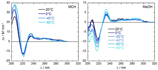 To further investigate the impact of the conformational freedom on the ECD spectra, variable temperature ECD (VT-ECD) spectra were recorded in MeOH and in MCH in the range from −80 to +20 °C (193–293 K), shown in Figure 3. The overall spectral shape is retained upon lowering the temperature in both solvents. The sign of the three major bands in the range 210–300 nm is preserved, accompanied by an intensity increase. For the spectra in MeOH, the increase is regular and more pronounced, and does not reach convergence at the lowest temperature used. The two stronger bands at 215 and 235 nm almost double their strength when passing from 20 °C to −80 °C (273 K to 193 K). In the same temperature range, the spectra in MCH experience a smaller intensity increase (25–30%) for both 220 and 235 nm bands. The trends observed in both solvents clearly indicate a fluxional situation at room temperature—especially in MeOH—which is quenched at low temperatures. A reason for the different behavior of the two solvents will be given below.