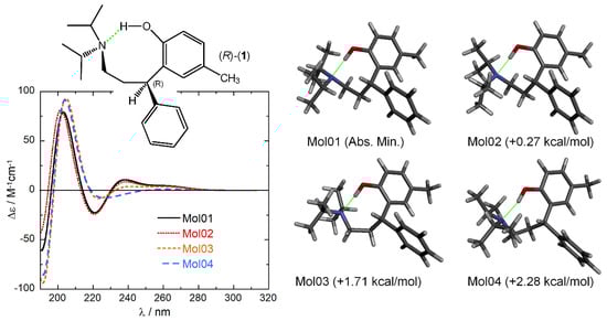 A conformational search was run on (R)-1 using a Monte Carlo algorithm and Merck Molecular Force Field (MMFF). Not surprisingly, the number of total conformers was huge: 247 within the pre-selected energy window of 10 kcal/mol, of which 54 within 5 kcal/mol, 4 within 2.5 kcal/mol, and only 2 within 2 kcal/mol. These latter showed an intramolecular O-H···N hydrogen bond defining an 8-membered cycle (see diagram in Figure 4). All 247 MMFF conformers were optimized with DFT at the ωB97X-D/6-31+G(d) level in vacuo, affording 89 optimized structures within 10 kcal/mol, 14 within 5 kcal/mol, and 4 within 2.5 kcal/mol (displayed in Figure 4). All the first 9 low-energy conformers showed the intramolecular O-H···N hydrogen bond.