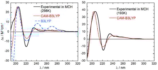 The first four low-energy conformers, covering 98.8% of the overall Boltzmann population, were considered for ECD simulations. Excited-state calculations were run with B3LYP and CAM-B3LYP functionals and def2-TZVP basis set in vacuo. Since ECD spectroscopy senses the chiral surrounding of the chromophores [], it was anticipated that the reciprocal orientation of the aromatic rings would determine the ECD response. Such expectation was reinforced by our previous experience with chiral tetraarylmethane [,,] and diarylmethane [] derivatives. In the case of (R)-1, however, the intramolecular hydrogen bonding locks the two aromatic rings in a fixed position, as witnessed by the fact that the four low-energy conformers differ only in the conformation of the isopropyl groups. Not surprisingly then, the four calculated ECD spectra are very similar to each other (Figure 4). The resulting Boltzmann-weighted average spectra at 293 K and 193 K are compared in Figure 5 with the spectra measured in MCH at the same temperatures. It is expected that this solvent will not disturb the intramolecular hydrogen bonding, so that our low-energy DFT structures will represent correctly the conformational situation. As discussed above, ECD spectra in MCH are only slightly temperature-dependent, probably because the population of hydrogen-bonded structures is already large at room temperature and cannot be raised much by lowering the temperature. Moreover, solvent field effects on ECD spectra are very small for low-polarity solvents such as MCH [], justifying our approach of running ECD calculations in vacuo. An attempt to reproduce the ECD spectra in H2O or MeOH would require an accurate treatment of hydrogen bonding which necessitates the inclusion of explicit solvent molecules [,,,], which is beyond the scope of our study. In fact, the result of VT-ECD experiments in MeOH suggests a more complicated conformational situation with respect to MCH, probably because of a temperature-dependent competition between solute-solvent hydrogen bonding and intramolecular hydrogen bonding.
