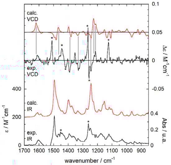 Experimental (black lines) and calculated (red lines) IR (bottom traces) and VCD (top traces) spectra of (R)-1. Experimental conditions: 0.18 M solution in CCl4, cell path length 100 μm. Calculations run at B3LYP/6-311+G(d,p) level, Boltzmann average over 40 conformers, plotted as sum of Lorentzians with γ = 6 cm−1, scaling factor 0.98. The vertical bands highlight the correspondence between experimental and calculated VCD peaks, while the asterisks (*) indicate experimental IR/VCD peaks with no calculated counterpart.