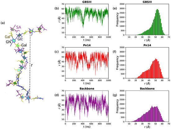 Polysaccharide end-to-end distance distributions for the 6RU PS. (a) The molecular end-to-end distance, r, is defined as the distance between O5 atoms in GlcNAc residues in RU1 and RU6, here shown on the GBSIII PS. The center column shows the r time series for (b) GBSIII PS, (c) Pn14 PS and (d) unbranched backbone PS. The corresponding distance distributions are in the rightmost column for (e) GBSIII PS, (f) Pn14 PS and (g) the unbranched backbone PS.