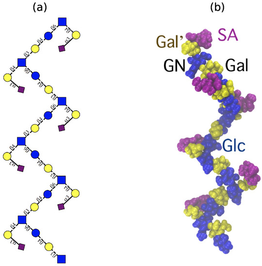 - González-Outeiriño, J.; Kadirvelraj, R.; Woods, R.J. Structural elucidation of type III group B Streptococcus capsular polysaccharide using molecular dynamics simulations: The role of sialic acid. Carbohydr. Res. 2005, 340, 1007–1018. [Google Scholar] [CrossRef] [PubMed]