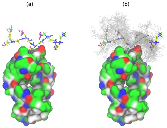This conformation is in very good agreement with the new antibody binding model recently proposed for GBSIII PS (see Figure 5 in Carboni et al. [13]). Figure 4 shows the GBSIII PS conformations from our 6RU simulation superimposed on the solved crystal structure for DP2-Fab. The zig-zag conformation of the backbone exposes the sialic acid side chain for binding (Figure 4a) with the flexible backbone held well away from the antibody over the course of the simulation (Figure 4b). Conversely, we find no evidence in our simulations to support the helical model for GBSIII PS previously proposed [10,11]. Further, in the zig-zag conformation, the polysaccharide backbone is relatively inaccessible to antibody binding.